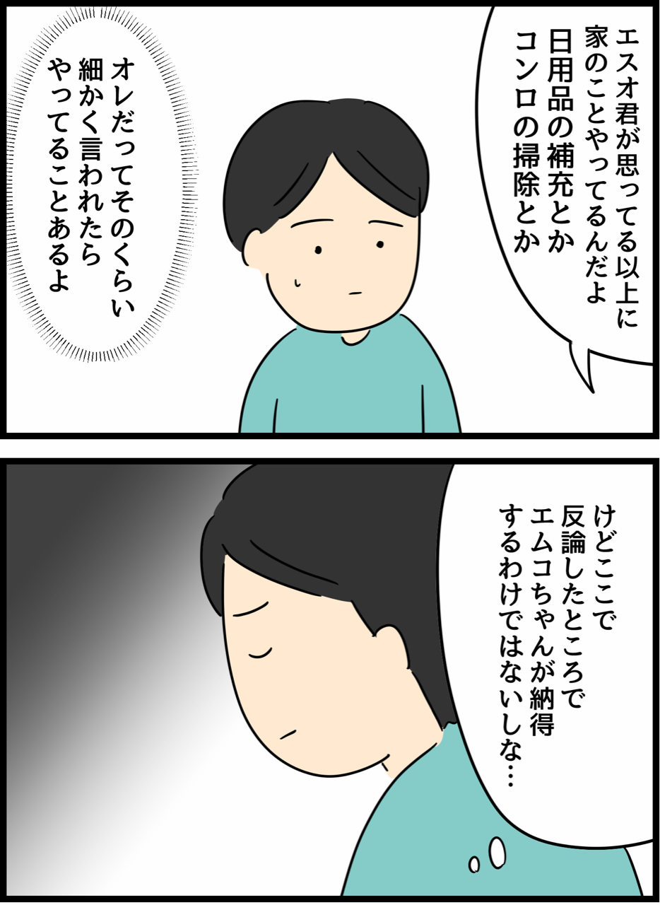 倦怠期の夫婦が大切なことに気づいた話14夫サイド 2021年09月30日 ①はこちら前回の14妻サイドはこちらつづきの15妻サイドはこちら※エピソードを妻サイド、夫サイド交互に描いていきます他おすすめ漫画 【他サイト連載】看護師の恋愛話束縛彼氏がストーカーにクラスチェンジした話(後編) 前編はこちら 【倦怠期の夫婦が大切なことに気づいた話】①妻/夫②妻/夫③妻/夫④妻/夫⑤妻/夫⑥妻/夫⑦妻/夫⑧妻/夫⑨妻/夫10妻/夫11妻/夫12妻/夫13妻/夫14妻人間まおのライン公式アカウントが始まりました!登録していただくとブログをアップした際にLINEに通知がいくのでワンクリックですぐ読めます🥳あと公式アカウント限定でイラストも時々アップしていく予定です✨よかったら登録お願いします送料無料 レディース ラテックス フルカップ 脇高 美胸 谷間UP 楽ブラ つけ心地 女性 大きい 綺麗 揺れない 痩せ見え 垂れ胸 おやすみ 20代30代40代 単品 ナイトブラ 大きい胸 新作 夏[スリーピングシープ] ひざたけ ワンピ ワンピース 膝丈 フレンチスリーブ 半袖 夏 リゾート 黒 ゆったり ベーシック セットアップ ベルト シフォン ショート xl 女 ライン カットソー 襟 シンプル 綿 流行り 茶色 大きい アウター タートルネック ボヘミアン 今期 パフスリーブ 柄 丸首 カシュクール カシュクールワンピース Vネック 大人 きれいめ 綺麗 BK-XLSleeping Sheep(スリーピング シープ)≪7/28(火)10:00 チャンスは24h!!送料無料1590円♪≫ ワンピース ロングワンピース レディース 選べる2タイプ!ウエストブラウジングカットワンピース レディース ワンピース ロング丈 ノースリーブ フレンチ [E2028] 夏 半袖 マキシ丈 ワンピ【送料無料】 スイーツ 中元 ギフト 10分間で2000本完売!幻のチーズケーキ(長方形)約2〜3名用【冷凍便】【あす楽対応】贈り物 お菓子 お取り寄せグルメ 高級 ブランド お洒落 美味しい ブランド スイーツ 2021 定番 有名パティシエ【スフレチーズケーキ ホールケーキ 洋菓子工房Ub】 敬老の日 敬老の日ギフト 送料無料 送料込 誕生日ケーキ バースデーケーキ お返し スイーツ 内祝 誕生日 無添加 無着色 人気 甘さ控えめ 冷凍 お取り寄せ 残暑見舞い 残暑お見舞い 「恋愛エピソード」カテゴリの最新記事 タグ :#みんなの体験談 < 前の記事次の記事 > コメント コメント一覧 (439) 前のコメントを読み込むためにはJavaScriptを有効にしてください。 読み込み中 403. もーもーもー 2021年10月01日 02:28 >>366 なんでその皿で食事しようとするの?? ササッと洗い直せば気持ち悪くないよ エスオくんもそうしてるよね その程度のミスなんじゃないの皿の汚れって タンスは私どうでもいいけどシワ伸ばしとけばする必要なかったアイロン出してかけてしまう手間の方が嫌や 0 人間まお がしました 164. ももにゃん 2021年09月30日 14:27 自分の行動が評価されないことを、エスオさんは恐れているのかな? 「オレなりに考えてやってる(ベストを尽くしている」のに「色々言われる(ダメ出しされる)」 エムコさんはダメ出しではなく、困るので別の方法でお願いしているだけ。 エスオさんはダメ出しにしか聞こえない。 新しい方法に挑戦する気力もない。 自分を正当化することでかろうじて自分を保っている。 いつもエムコさんの顔色をうかがっている。 顔色をうかがっているわりには、エムコさんと何かを楽しもうとはしない。 エムコさんと一緒にいても、別の事で頭がいっぱい。 会社で何かあったのだろうか? 相当ストレス抱えている様子だし、自分なりにがんばっているけれど、会社に評価されない状況に置かれているとか。 パワハラ的上司がいるとか。 家事分担問題はさておいて、エスオさんの話を聞けば聞くほど「エスオさん、大丈夫?」という気持ちになってきました。 エムコさんにお話し聞いてもらえばいいのに。 0 人間まお がしました 211. 名無し 2021年09月30日 15:07 >>164 パワハラ上司→エムコ むしろ家庭内に問題があって仕事に影響出てきてる可能性が 0 人間まお がしました 166. 通りすがり 2021年09月30日 14:31 家に入れるお金を妻の倍に、家事はお手伝い程度で解決しないかな。 家事は才能だから向き不向きは仕方ない。 0 人間まお がしました 219. 名無し 2021年09月30日 15:12 >>166 不器用すぎて包丁もったらほぼ怪我するので料理出来ないです なので料理(料理に必要な買い出し含む)はパートナー、その他は自分が全部やってもいい ※まあ相手がいないのでただの理想ですが 0 人間まお がしました 224. パートナーできそう! 2021年09月30日 15:14 >>219 カッコいい✨ 0 人間まお がしました 168. ー 2021年09月30日 14:33 よく議論になってる皿VS洗濯物 サッと洗い直すのとアイロンかけるのじゃ ちょっと労力に差があるよね〜 カーディガンの洗濯バサミのあととか なかなか直らないし… 0 人間まお がしました 209. X 2021年09月30日 15:07 >>168 油汚れも中々落ちないことあるけど 0 人間まお がしました 217. そこは 2021年09月30日 15:10 >>209 放置したら落ちないよね 水につけとくか事前に