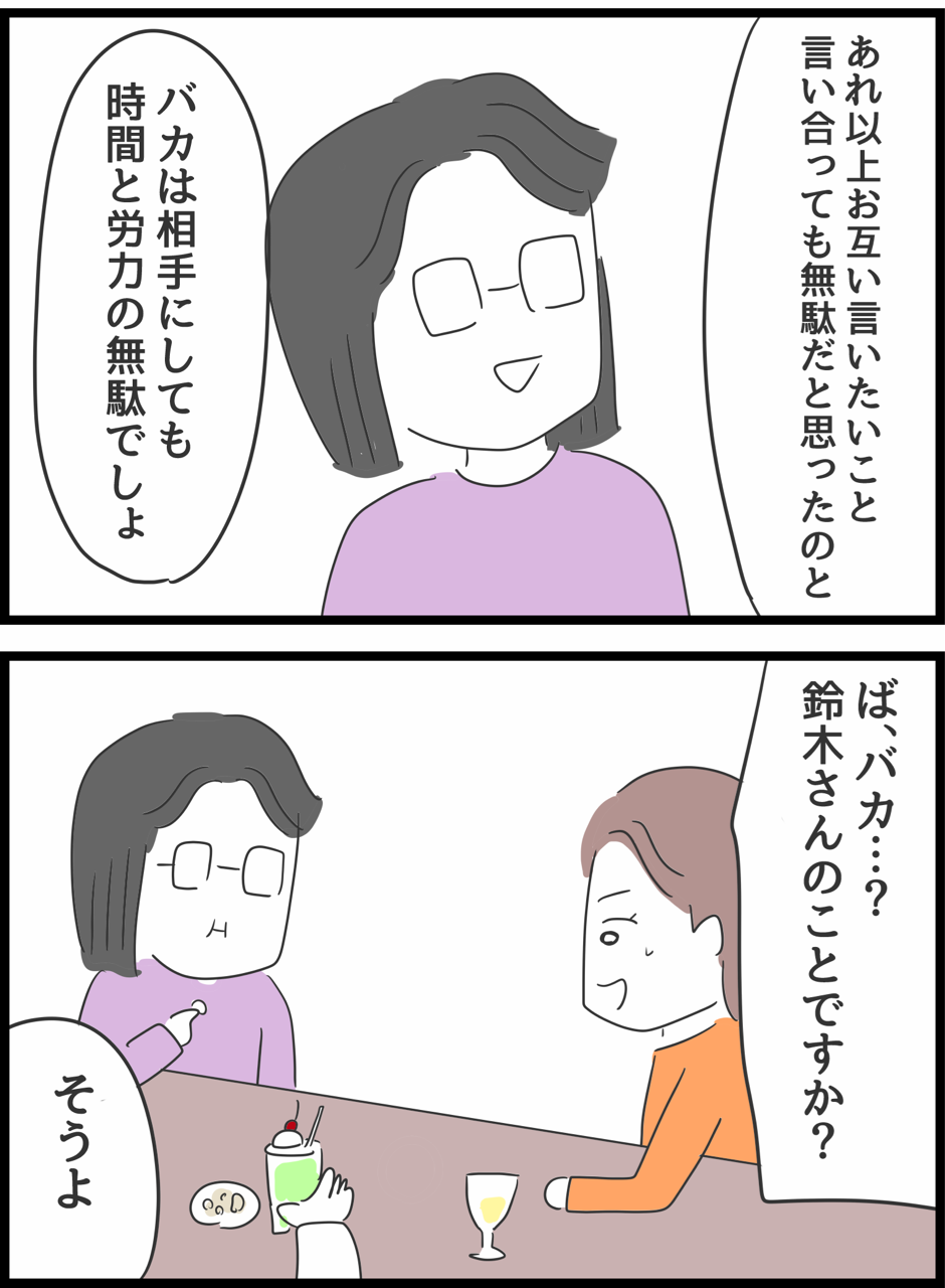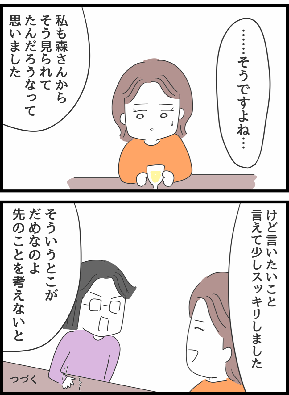 何考えてるの、山田さん!55 2022年02月05日 1はこちら 前回の つづき ↓おすすめ漫画↓後編アップされました👇人懐っこい同僚が豹変?!前編はこちら👇登録していただくとブログをアップした際にLINEに通知がいくのでワンクリックですぐ読めます🥳楽天Room開設しました✨買ってよかった物やリピートしている食べ物を紹介しているよよかったらのぞいてってね 「何考えてるの、山田さん!」カテゴリの最新記事 タグ :#山田さん < 前の記事次の記事 > コメント コメント一覧 (59) 1. あー 2022年02月05日 12:03 山田さん優しすぎん? 0 人間まお がしました 2. まあ 2022年02月05日 12:03 山田さん賢いわ 0 人間まお がしました 3. モヤる 2022年02月05日 12:07 「私も森さんからそう見られてたんだろうなと思いました」 え、山田さんからは? 山田さんにしたことは、以前にちょっと後悔しただけで済ませてる。 ダメじゃん。 0 人間まお がしました 7. 2022年02月05日 12:24 >>3 とはいえ気付いたのでようやく少し前進したなと 0 人間まお がしました 10. さっちゃんの気持ち 2022年02月05日 12:38 >>7 それを聞かされたさっちゃんは、大人だからスルーしてくれてるけど、 もし全てを知ってる第三者がそこにいたら、「いや森さんだけに思うことじゃないでしょ」って言いたくなるだろうな。 0 人間まお がしました 15. 高橋さんは 2022年02月05日 12:56 >>3 器のデカイの山田さんからしたら、復讐する気も起きない相手にするだけ無駄な存在なんでしょ 周り(読者)が勝手にモヤってるだけで山田さんはもうどうでもいいことかもしれないし 0 人間まお がしました 16. ひろ 2022年02月05日 12:57 >>3 この女は山田さんをマウントしているな。 だいぶ助けられてるけど、そこに感謝はあるんかな。 0 人間まお がしました 57. 絶対 2022年02月06日 23:32 >>16 無いよね。 0 人間まお がしました 19. 2022年02月05日 13:21 >>3 この性格になった山田さんが何も言わないならもういいってことでしょ 周りがとやかく言うことではない 0 人間まお がしました 30. え 2022年02月05日 15:16 >>19 二次元の山田さんに対して、周りって、、、読者のこと? 0 人間まお がしました 37. そう 2022年02月05日 17:49 >>30 そうだよ 0 人間まお がしました 40. いやいや 2022年02月05日 19:45 >>37 「山田さんに読者がとやかく言うことじゃない」って変だよ〜。 これ漫画だもの。 で、ここ漫画のコメント欄だもの。 0 人間まお がしました 43. ほーい 2022年02月05日 21:04 >>40 わかったー 0 人間まお がしました 48. んー 2022年02月06日 00:21 >>43 そういうとこがだめなのよ〜 0 人間まお がしました 24. 小手毬 2022年02月05日 13:49 >>3 そういうとこがだめなのよ!案件。 0 人間まお がしました 33. みるる 2022年02月05日 16:26 >>3 山田さん優しいわね。 0 人間まお がしました 4. むにゃむにゃ 2022年02月05日 12:10 人間、すべてのものの見方がすぐに変わるわけではないんだな。 でもだから「もうやめたんです!」と人前で言えたのは大きいわ 0 人間まお がしました 5. アホなんだろうけど、ひどい 2022年02月05日 12:12 自分が過去にひどいことをした、しかも目の前にいる人を差し置いて、森さんのことだけを挙げる高橋。 0 人間まお がしました 6. けっ。 2022年02月05日 12:17 バカって言葉に対して『そんなこと言っていいの?』みたいに反応してるけど、高橋がさっちゃんにしてきたことはもっと下等なはず。 0 人間まお がしました 8. あーもうめちゃくちゃだよ 2022年02月05日 12:28 あのまま決着つければ良かったのに… 0 人間まお がしました 34. みるる 2022年02月05日 16:26 >>8 作戦てもんがあるしょ 0 人間まお がしました 49. そうじゃなくて 2022年02月06日 00:26 >>34 あそこで高橋と鈴木が潰し合えば良かったって思ってるんでしょ。鈴木だけ追い払って、過去も現在も山田さんに迷惑をかけてる高橋だけ許してあげるのはオカシイヨ。 0 人間まお がしました 9. ぶた 2022年02月05日 12:33 クリームソーダ飲んでるの推せる 0 人間まお がしました 11. あかり 2022年02月05日 12:41 ボイスレコーダー持参で呼び出しておけば、あの場で終わってたのに… 0 人間まお がしました 12. やまださん 2022年02月05日 12:44 お、味方になってくれてる…? どんな作戦でいくのー? 0 人間まお がしました 13. その場足踏み 2022年02月05日 12:46 高橋は、 自分と山田さんのことを全然正しく見てない。 なのに、鈴木と佐藤のことばかり見て、そこに関わってる自分の感想だけ言ってる。 高橋はあまり成長してない気がする。 0 人間まお がしました 14. まーぼ 2022年02月05日 12:49 高橋の過去をサルベージしたがりがいっぱいいるが、山田本人が前に哀れみで復讐する気もおきんって言ってたやん。 山田からしたらもうネチネチ掘り返す気にもならんヤツって判断したんだろ。 私も学生時代に山田と似たような経験あるけど、イジメた相手を許してはいないがいつまでも恨むのも馬鹿らしいから、さっさと忘れたらどうでもよくなって吹っ切れた。 0 人間まお がしました 58. だよね 2022年02月06日 23:34 >>14 学生時代に下らん事し
