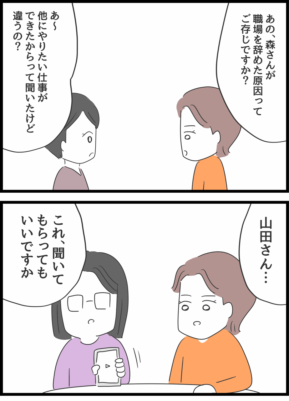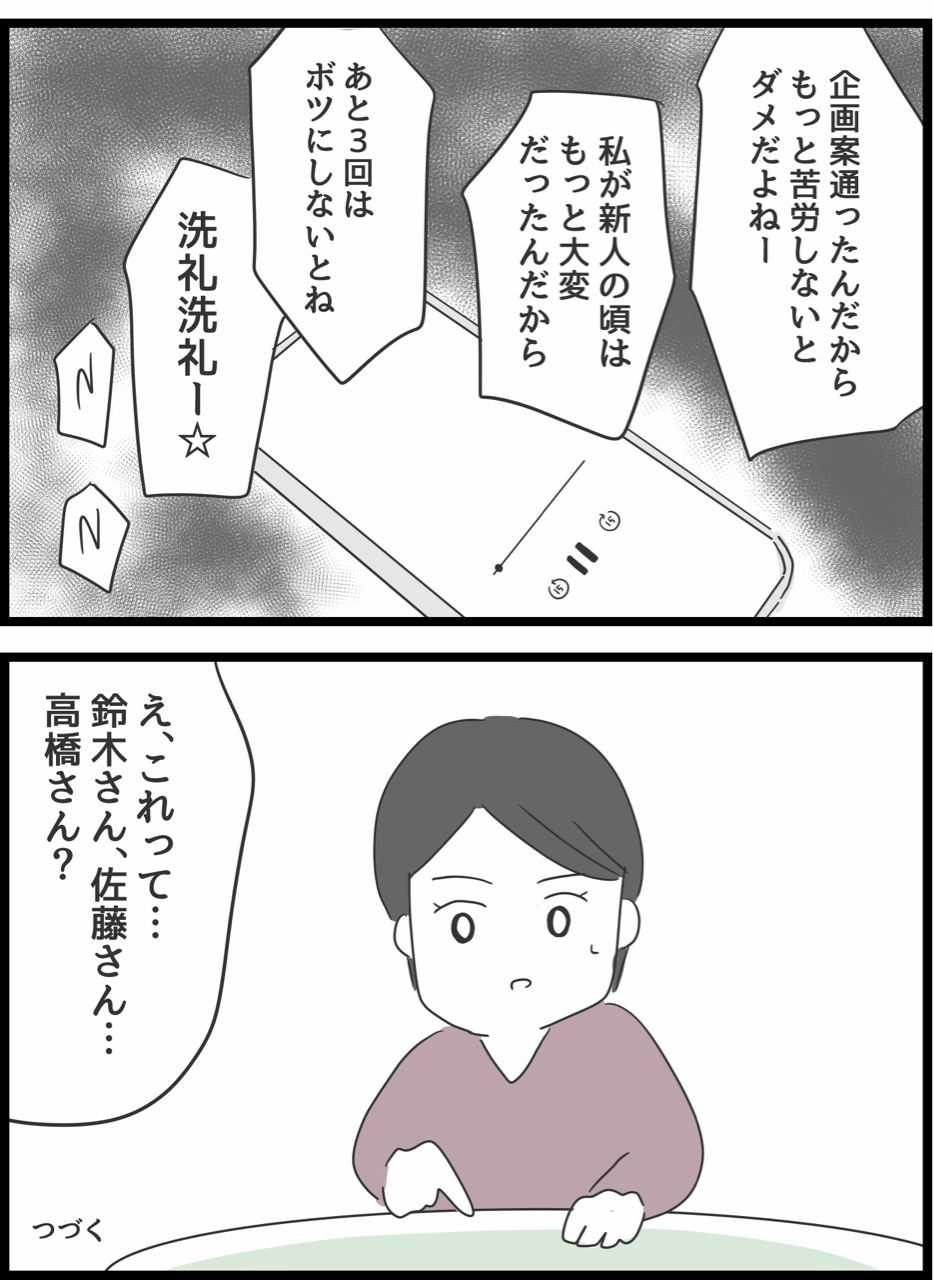 何考えてるの、山田さん!57 2022年02月07日 1はこちら 前回の つづき ↓おすすめ漫画↓後編アップされました👇人懐っこい同僚が豹変?!前編はこちら👇登録していただくとブログをアップした際にLINEに通知がいくのでワンクリックですぐ読めます🥳楽天Room開設しました✨買ってよかった物やリピートしている食べ物を紹介しているよよかったらのぞいてってね 「何考えてるの、山田さん!」カテゴリの最新記事 タグ :#山田さん < 前の記事次の記事 > コメント コメント一覧 (53) 1. ななし 2022年02月07日 12:02 やっぱり排除にかかったか👏🏻 0 人間まお がしました 2. うむ 2022年02月07日 12:03 正しいやね 0 人間まお がしました 3. ぽ 2022年02月07日 12:02 軍師、山田。 0 人間まお がしました 4. あぁー 2022年02月07日 12:03 人の案件でかい! まぁ証拠と退職という大きなことがあるから、確実なんだろうけど。 0 人間まお がしました 28. あぁー 2022年02月07日 13:35 >>4 あ、高橋の声付きか! 高橋が保身せずに話すかに注目だな。 0 人間まお がしました 36. それな 2022年02月07日 17:22 >>28 作者の判断次第だけど、まさか 0 人間まお がしました 5. 企画の相談? 2022年02月07日 12:04 と思って聞いたらこんな低レベルな相談でびっくりしちゃっただろうな(´・ω・`) 0 人間まお がしました 17. とはいえ 2022年02月07日 12:26 >>5 今の社会、こっちの方が大事だよね? 人の命にも関わりかねないしね 0 人間まお がしました 6. 2022年02月07日 12:04 この上司、、気付いてて流してるのかと思ったら知らなかったのか、、 上司もヤバいよ、、この会社、、 0 人間まお がしました 10. @ 2022年02月07日 12:10 >>6 それ。割と直属の上司っぽいし、気付いてて欲しかった。 0 人間まお がしました 12. 気づいてないふりしてるだけじゃない? 2022年02月07日 12:13 >>6 見て見ぬふりしてたなんてバレたらそれはそれで大変だろうし 0 人間まお がしました 7. 石田 2022年02月07日 12:05 え、このタイミングで高橋さんまで排除???うそ?? 0 人間まお がしました 15. どうでしょう。 2022年02月07日 12:17 >>7 高橋さん自身も納得の上での上司への暴露かもしれません。 0 人間まお がしました 24. ななし 2022年02月07日 13:20 >>7 高橋は、自分の言動も反省した上で報告することにしたのかな。 0 人間まお がしました 8. もっと早く 2022年02月07日 12:06 やればよかったんではないかな… と 山田以外ですが 思うんですよ 0 人間まお がしました 43. いつ? 2022年02月07日 21:08 >>8 これ漫画だからね。 0 人間まお がしました 9. 山田 2022年02月07日 12:08 山田さんナイス 0 人間まお がしました 11. @ 2022年02月07日 12:11 え、山田さん高橋も排除する気なの?!?!(コメ欄見て気付いた) 鳥肌やばい!!!!!! 0 人間まお がしました 13. 上司の反応見た限り 2022年02月07日 12:14 >>11 高橋の声も入ってそうだな 0 人間まお がしました 16. 高橋自身 2022年02月07日 12:21 >>11 「まぁ私はイマイチとしか言ってないから大丈夫か…」て言ってたしこの録音に関しては高橋は自分はセーフと思ってのことなんじゃなかろうか 決めるのは他人だけど 0 人間まお がしました 23. まあね 2022年02月07日 13:08 >>16 わざと企画書没にしたり、自分が指示したのに言ってないとか森さんを嵌めたりしてたけど、高橋は仕事を直接妨害したりはしていないしね。ギリセーフなんじゃない? 0 人間まお がしました 30. 2022年02月07日 14:10 >>11 高橋は自分も鈴木が怖くてとか言い訳すればいいだけだから余裕でしょ 0 人間まお がしました 14. 回転焼き 2022年02月07日 12:14 いやこれ、高橋は反省した体で他の二人を告発するってことなんじゃね? 高橋、なんかやはり好きになれないな… 上司は薄々気づいてなかったんかい! 0 人間まお がしました 18. 上司 2022年02月07日 12:32 上司からしたら、高橋自身の声が入ってるのに本人が言いに来たので、どう扱って良いのか悩むだろぬな。 高橋が腰巾着であったことも洗いざらい話した上で、3人とも厳しく注意されるのが良い。 注意だけで済むのかどうかは上司の匙加減だけど、これで雰囲気が良くなれば山田さんは(高橋も?)目的達成かな。 0 人間まお がしました 19. ★ 2022年02月07日 12:32 環境変えるにはこれしかないね。笑 0 人間まお がしました 20. ぱっぱらぱー 2022年02月07日 12:43 鈴木佐藤にくってかかってたけど最初からこうすれば良かったんでないの?それとも森さんの件で自分は2人に合わせただけという意識だから自分の事守ろうとしてたのか? 0 人間まお がしました 21. うそん。 2022年02月07日 12:46 上司気づいてなかったのが驚き。 ずっと続いてたっぽいから薄々でも気づいてるかと思ってた。ずっとここの部署だったわけじゃないのかな? 見て見ぬふりはありそうっちゃありそうだけど、だとしたら白々しすぎてすごいわ。 0 人間まお がしました 22. クズ 2022年02月07日 12:46 2人追い出したとしても高橋が第二の鈴木佐藤になるだけだろこれ 0 人間まお がしました 29. そもそも 2022年02月07日 13:53 >>22 高橋は既に第二の佐藤(腰巾着)だし、鈴木にも前任者おるし。 さっちゃ