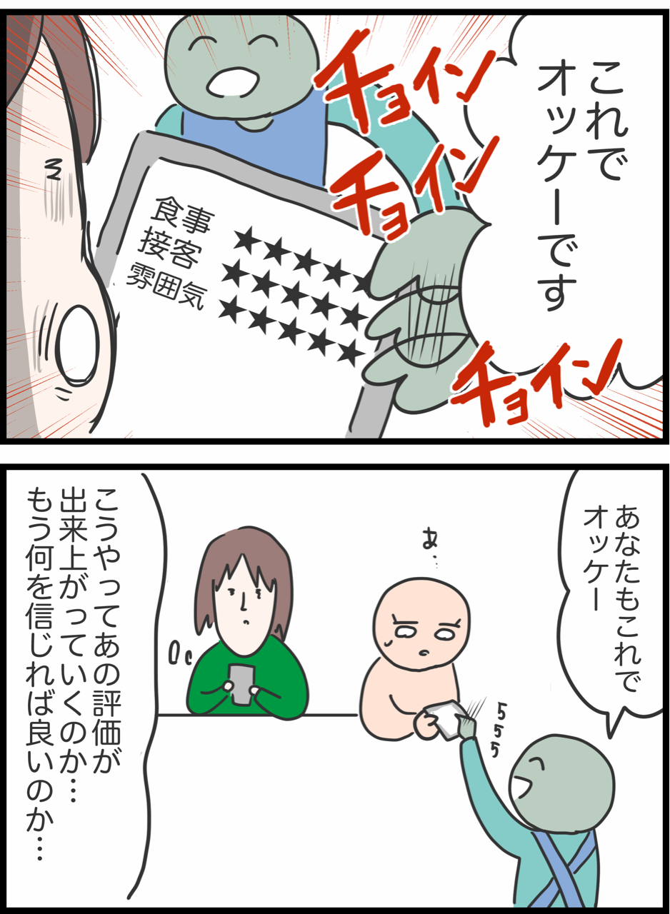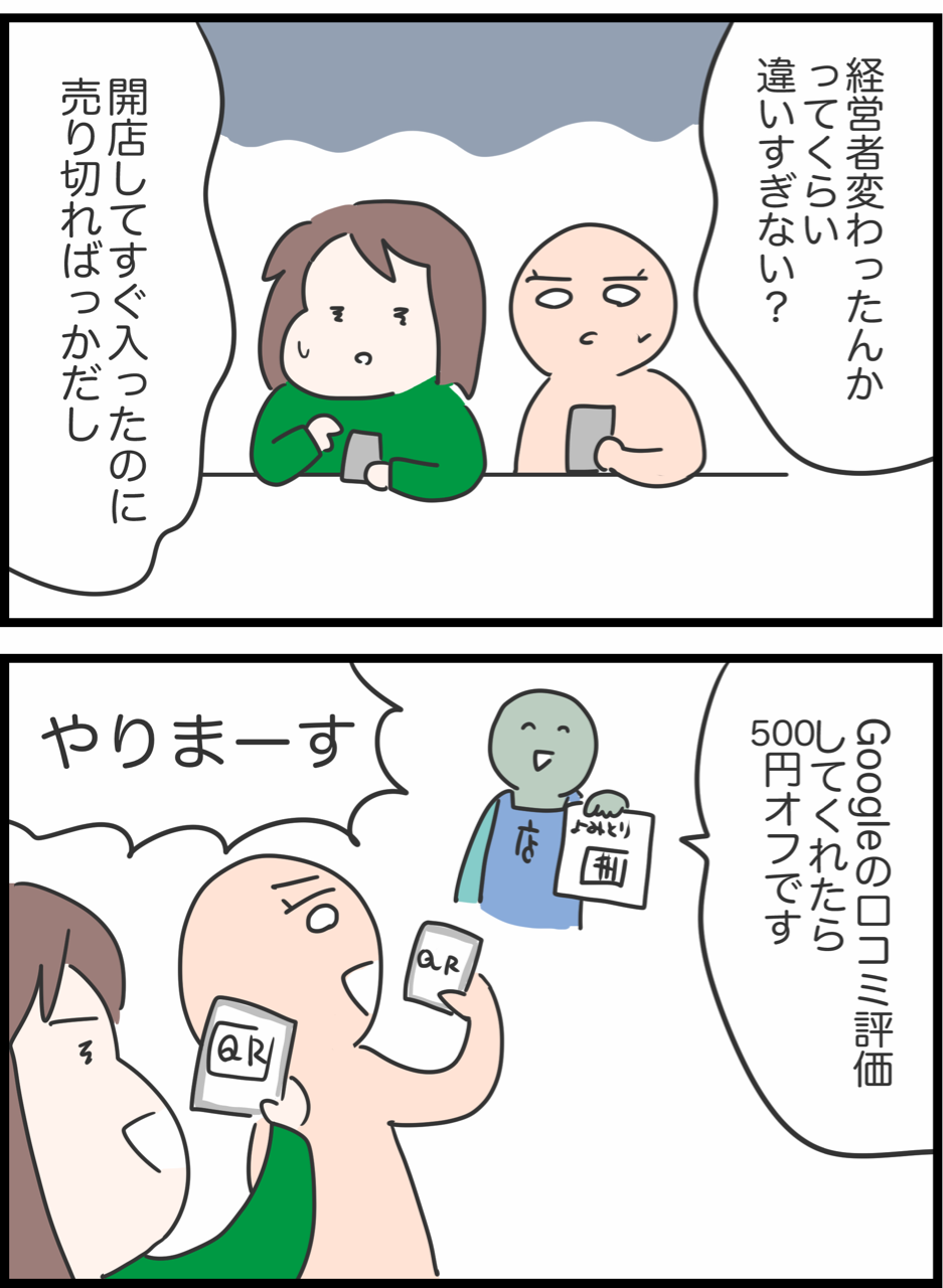 評価の闇 2026年02月15日 ちなみに食べログも3.5で高評価だった!写真のお肉は分厚くてつやっつや…フライドポテトはおいしかったほっこり漫画のまとめ本つくったよ!!🔽無料です! Kindleで一気読みできます(無料)⤵︎アプリで通知を受け取る公式LINEで通知を受け取る⤵︎📖!単行本発売中です!📖 「半ニートの生活」カテゴリの最新記事 < 前の記事 コメント コメント一覧 (1) 1. ななし 2026年02月26日 22:37 Amazonレビュー求めるやつみたいなの、飲食店にもあるんですね! Google口コミ投稿は簡単に修整できるので、自分なら退店後即星一つにしそうです笑 0 人間まお がしました コメントフォーム 名前 コメント 記事の評価 リセット リセット 顔 星 情報を記憶 コメントを投稿する