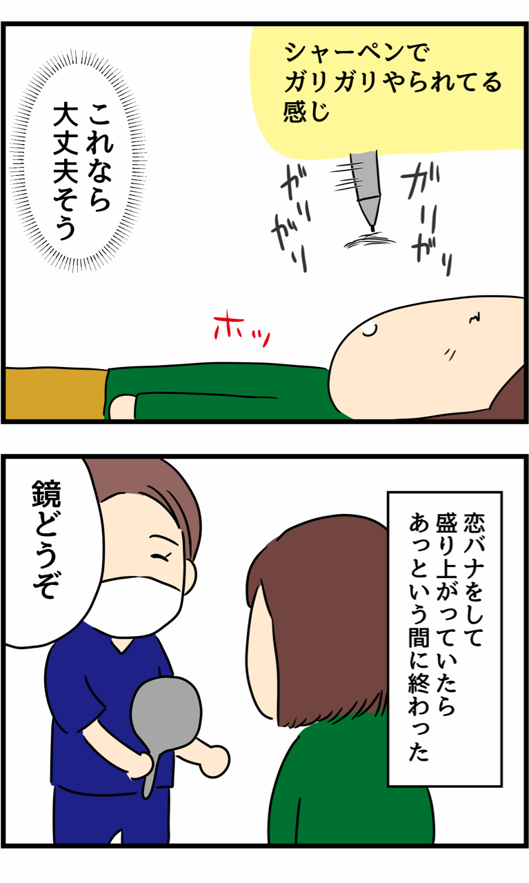 シャーペンでガリガリというのがとても参考になりました。やることになったら私も麻酔長めにしてもらおうと思いました。